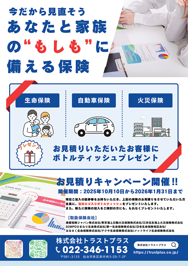 現在ご加入の証券等をお持ちいただき、生命保険、自動車保険、火災保険の保険のお見積りをさせていただいた方全員に、